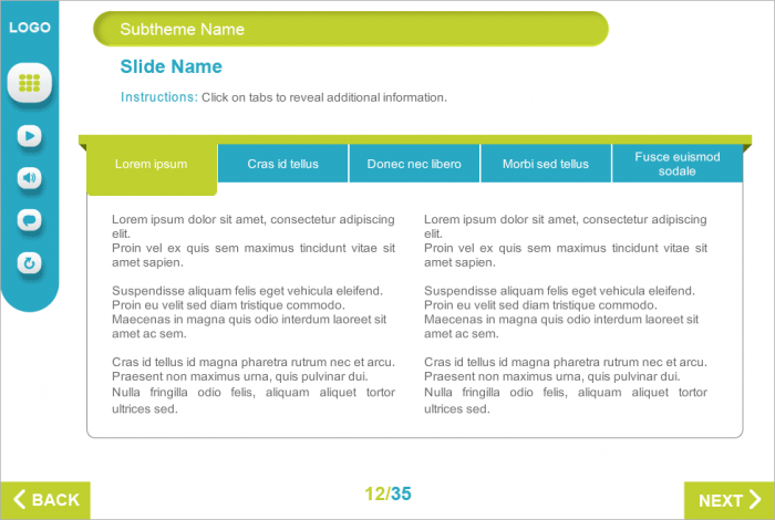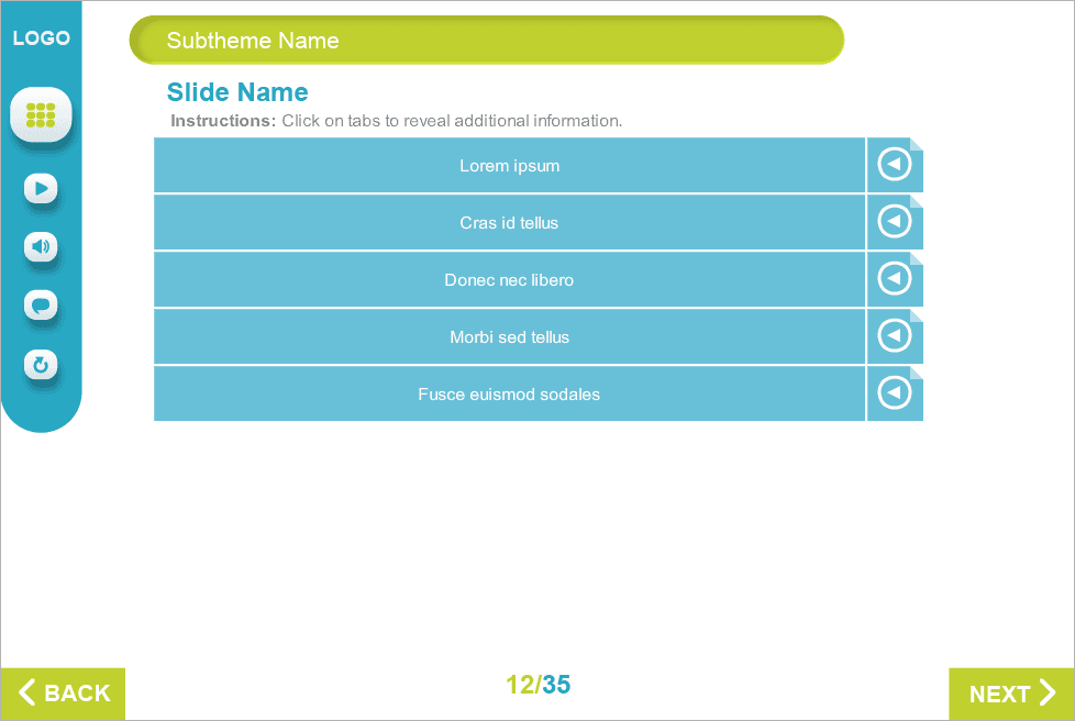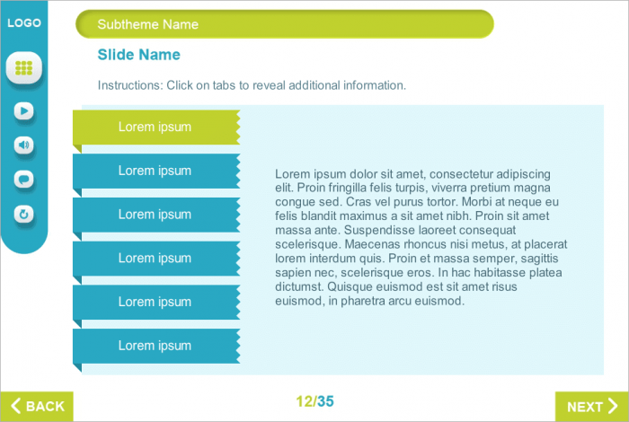 The package consists of 1 course player and 12 interactive slides that have similar design. It is a perfect toolkit for creating your own e-learning courses, suitable both for tablet and PC. No special skills are required to work with these templates. Big navigation keys allow to view content on a small screens or modern smartphones. It’s recommended to use on electronic devices with screen size 7 inches or more.