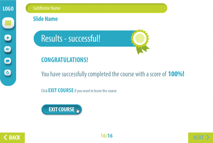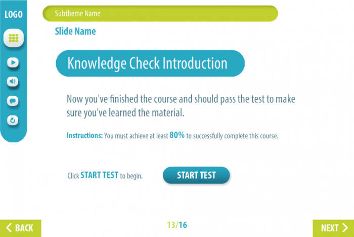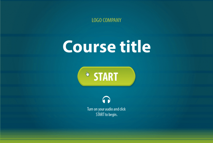 - Course player features: custom course map, custom navigation, custom voice/animation control, glossary, resources, closed captions, audio player, video player, quizzes which transfer data to LMS