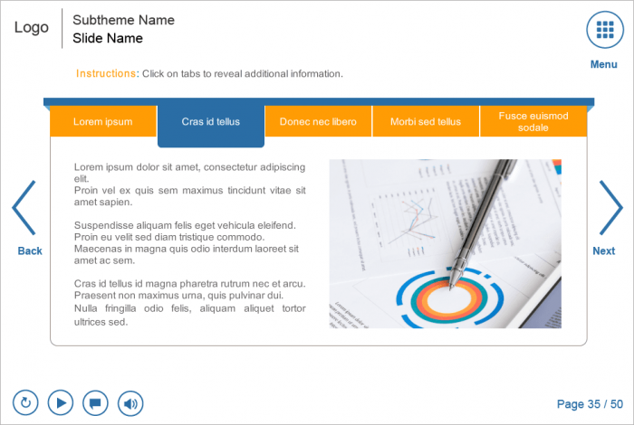 The course player contains character, flip-chart image and three versions of image slides. Different types of interactions invented to display any kind of additional information by clicking on visual objects. All items are already designed and prepared for usage.