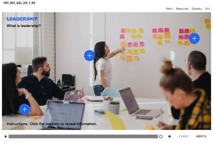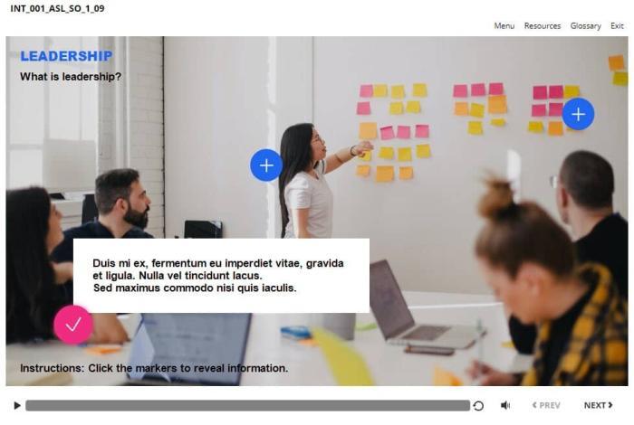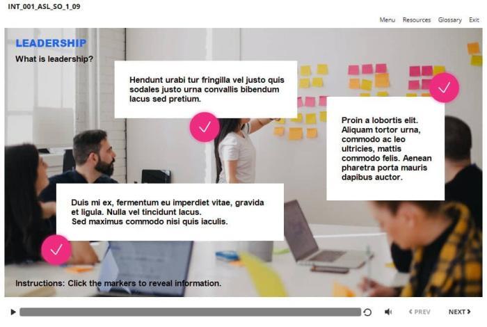 Leadership Markers — Storyline Template. The unique eLearning interaction is designed with Articulate Storyline 360 software. It is fully compatible with Articulate 3. The template contains 3 round buttons with icons. The user must click each of them to reveal the additional materials. The template is a ready-made product: all you need is to insert it into the projects and fill with own training content. It’s recommended to launch it on the devices with the screen size more than 7 inches.
