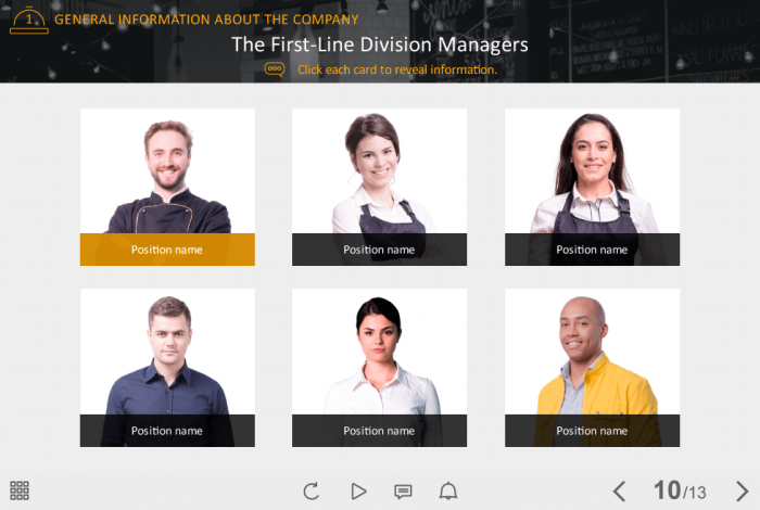 Storyline Clickable Cards Template. The ready-made interactive slide would be a great helper for creating powerful training courses. It contains 6 clickable cards invented to reveal the learning materials. The user must click on each object to view the course information in pop-ups. The template is already designed and prepared for usage.
