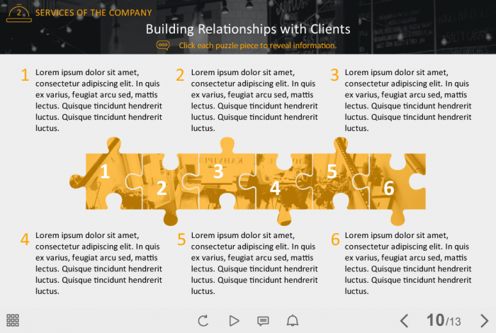 Storyline Clickable Puzzle Pieces Template. The ready-made interactive slide would be a great helper for creating powerful training courses. It contains 6 clickable objects designed in the form of puzzle pieces. The user must click on each puzzle to reveal the course information on the same slide. The template is already designed and prepared for usage.