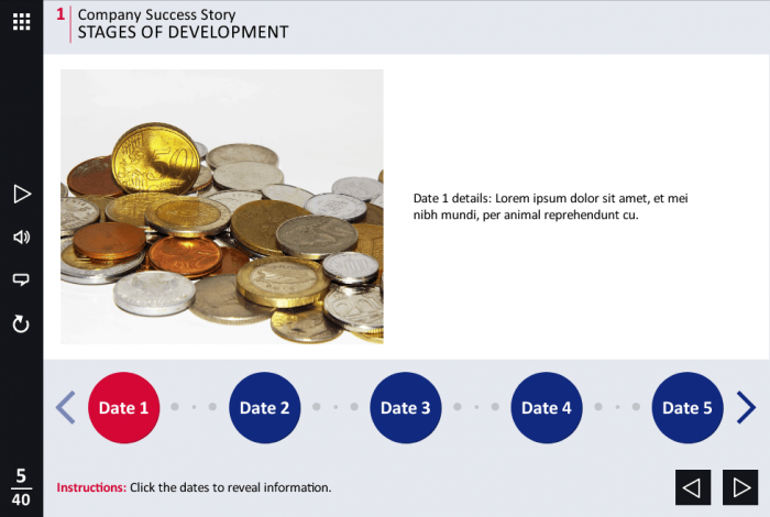 Timeline with Round Buttons — Storyline Template. This interactive slide is designed with Articulate Storyline 2 software. It is fully compatible with the recent versions: Storyline 3 and 360. The template contains 9 round buttons placed at the buttom part of the screen. The user must click on each button to reveal the additional information.