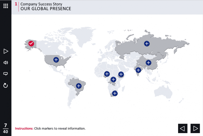 World Map with Markers — Storyline Template. This interactive slide is designed with Articulate Storyline 2 software. It is fully compatible with the recent versions: Storyline 3 and 360. The template contains 10 round buttons placed over the world map image. The user must click on each button to reveal the additional information in pop-up windows.