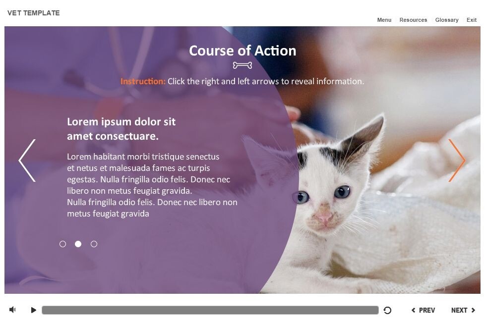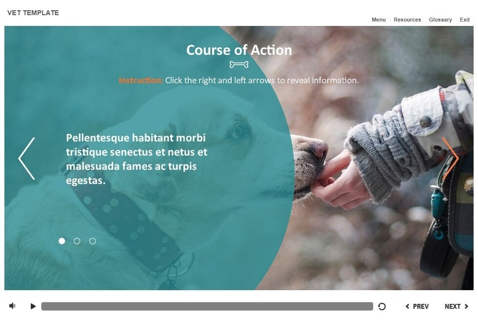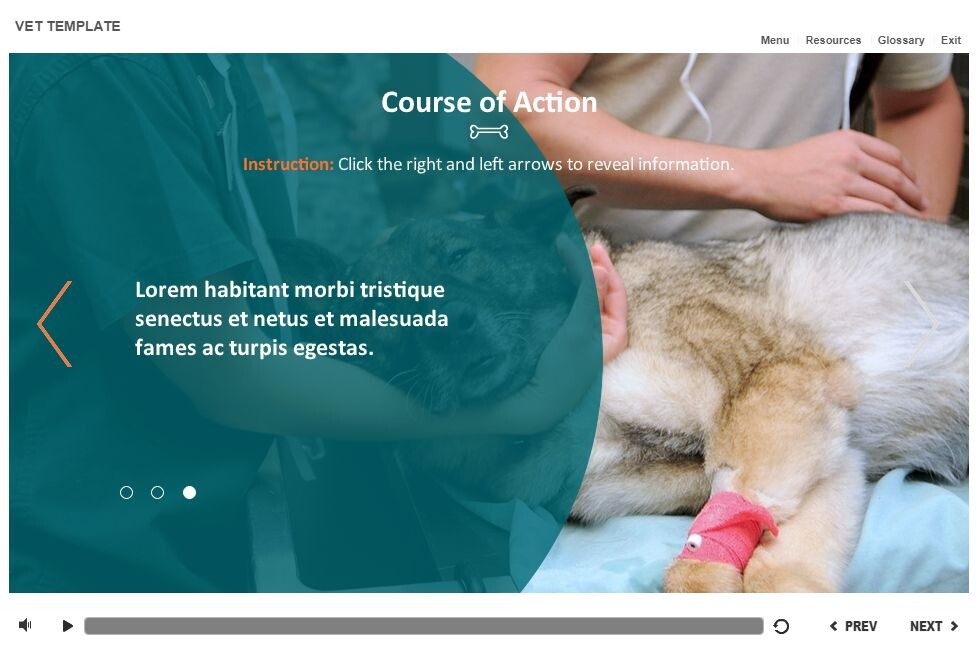 Vet Slideshow — Storyline Template. The unique eLearning interaction is designed with Articulate Storyline 2 software. It is fully compatible with the most recent versions: Storyline 3 and 360. The template represents a classic slieshow that is composed of three slides. The user must click on the left and right arrows to switch between the slides and reveal the additional materials. The template slide is a ready-made product: all you need is to insert it into the projects and fill with own training content. We recommend to launch it on the devices with the screen size more than 7 inches. We’ve collected lots of Articulate Storyline templates to speed up the course development and to save you from routine work.