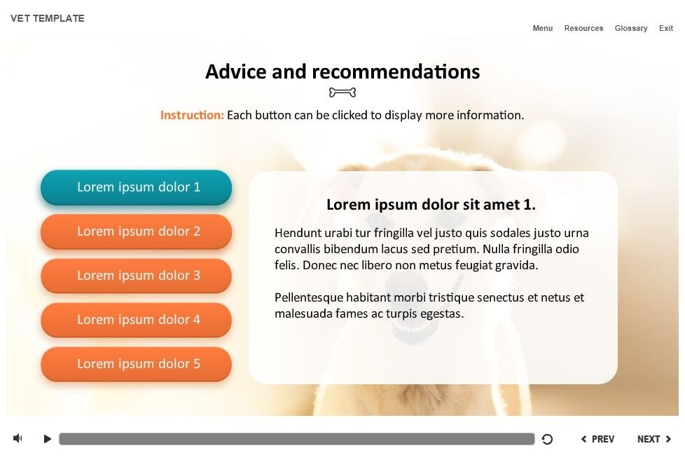 Five Tabs — Storyline Template. The unique eLearning interaction is designed with Articulate Storyline 2 software. It is fully compatible with the most recent versions: Storyline 3 and 360. The template contains 5 clickable tabs placed at the left part of the screen. The user must click on each tab to reveal the additional materials. The interactive slide is a ready-made product: all you need is to insert it into the projects and fill with own training content. We recommend to launch it on the devices with the screen size more than 7 inches. We’ve collected lots of Articulate Storyline templates to speed up the course development and to save you from routine work.