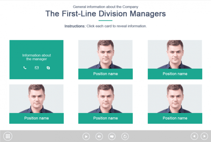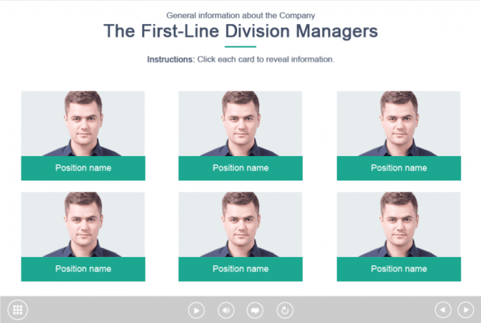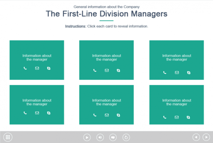 Captivate Grid Template. Designed in white and green colours, this Captivate Template would be a perfect choice to provide the course information. It contains six clickable blocks invented to reveal the training materials. The template is based on Adobe Captivate 9 software. It is possible to build it into any Captivate Course Template you need.