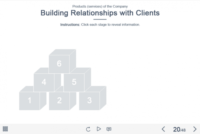 Captivate Six Clickable Cubes Template. Designed in white and grey colours, this Captivate Template would be a perfect choice to provide the course information. It contains six clickable buttons designed in the form of grey cubes. The user must click on each of them to reveal the training materials. The template is based on Adobe Captivate 9 software. It is possible to build it into any Captivate Course Template you need.