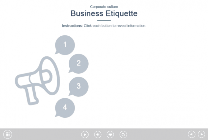 Captivate Loudspeaker With Round Buttons Template. Designed in white and grey colours, this Captivate Template would be a perfect choice to provide the course information. It contains four clickable round buttons invented to reveal the learning materials. The template is based on Adobe Captivate 9 software. It is possible to build it into any Captivate Course Template you need.