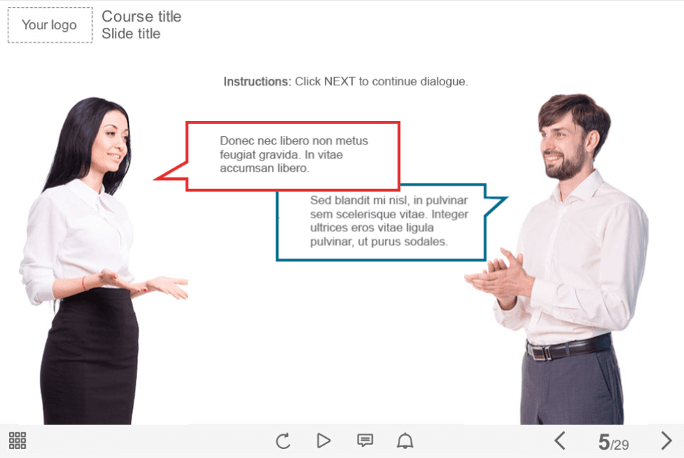 Dialogue Between Colleagues — Captivate Template. It contains 3 interactive slides with the cutout characters talking to each other: a handsome young businessman with an attractive young woman. The user must click on the next button to view the whole visual story. The template is based on Adobe Captivate 9 software. It would be a great helper to create your own eLearning course. Perfectly runs on both PC and Tablet with screen larger than 7 inches. We’ve collected a huge variety of Adobe Captivate templates especially for elearning developers. Just browse through our templates library and pick any item(s) you need to create a fascinating visual story.