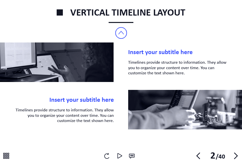 Vertical Slideshow — Captivate Template. The eLearning interaction slide would become a great addition for your eCourse. It represents a classic slideshow and contains 2 slides. The user must click on the up and down arrows to switch between the slides and reveal the additional information. The template is compatible with Captivate 9 or higher. All you need is just to paste the template into your project and to fill it with own learning materials. Try to create better courses with our amazing Adobe Captivate templates!