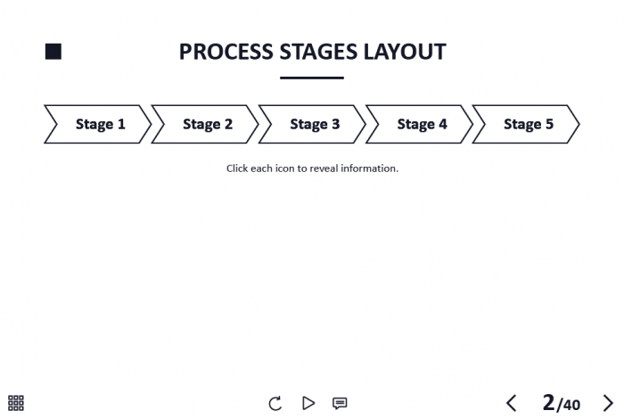 Process Stages Arrow Buttons — Captivate Template. The eLearning interaction slide would become a great addition for your eCourse. It contains 5 arrow buttons placed at the top part of the screen. The user must click on each button to reveal the additional information. The template is compatible with Captivate 9 and higher versions. All you need is just to paste the template into your project and to fill it with own learning materials. Try to create better courses with our amazing Adobe Captivate templates!
