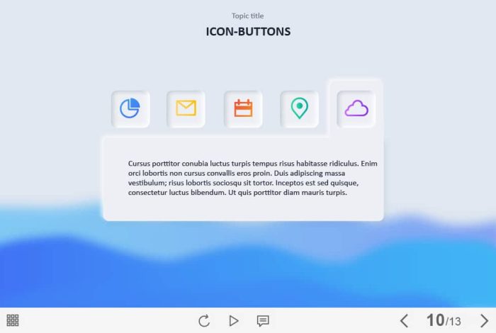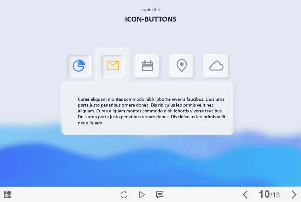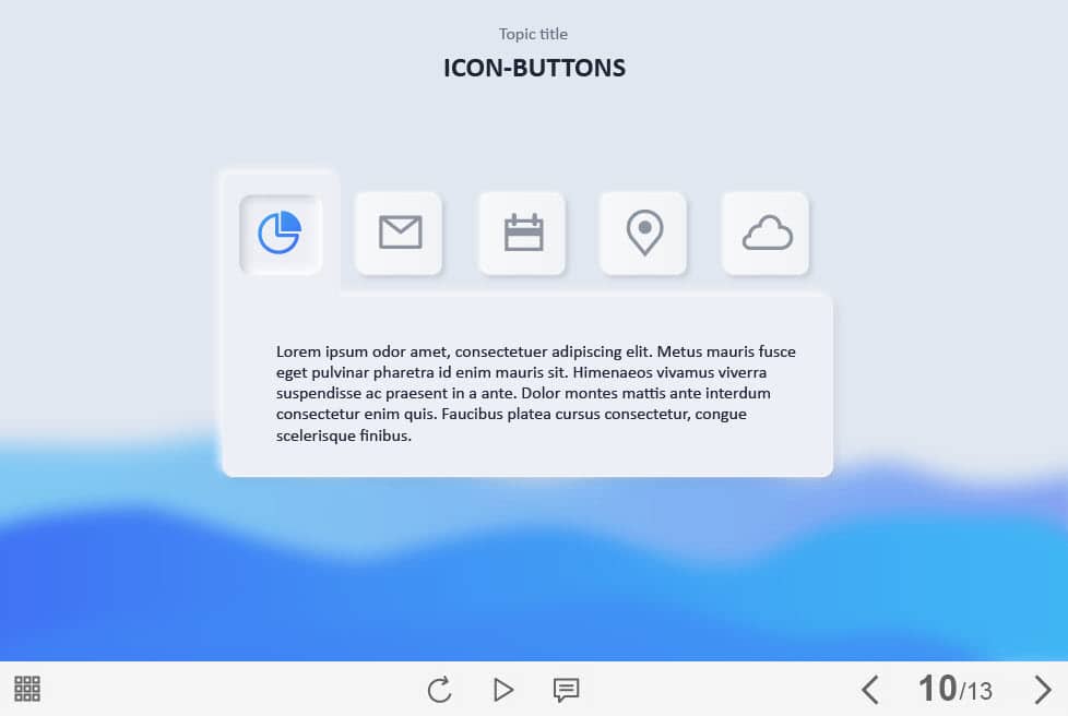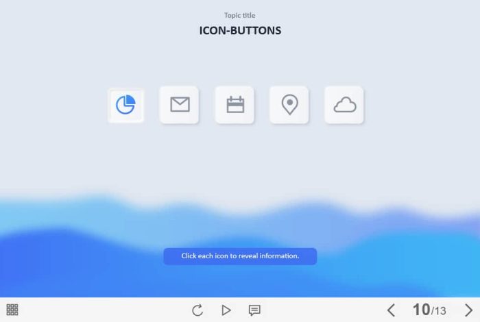 Five Icon Tabs — Captivate Template. The eLearning interaction slide would become a great addition for your eCourse. It contains five clickable icons placed at the center of the screen. The user must click on each of them to reveal the additional information. The template is compatible with Captivate 2019 software. All you need is just to paste the template into your project and to fill it with own learning materials. Try to create better courses with our amazing Adobe Captivate templates!