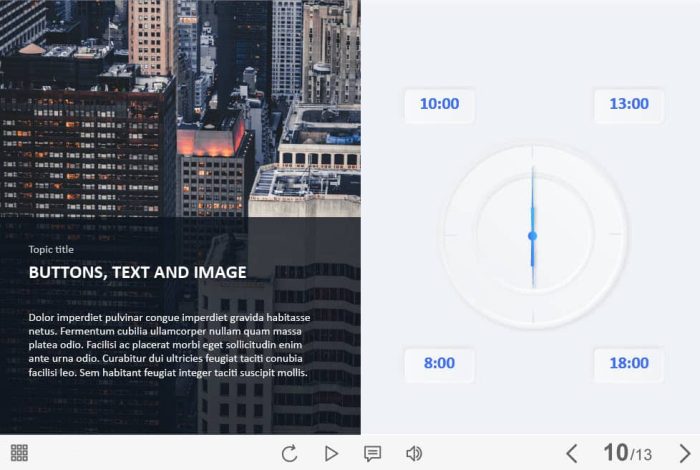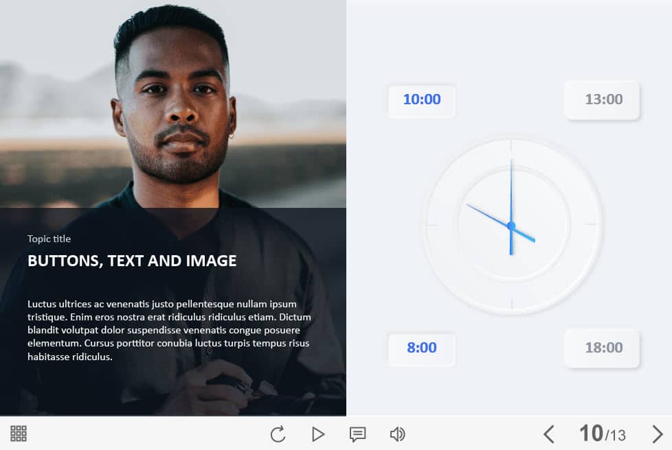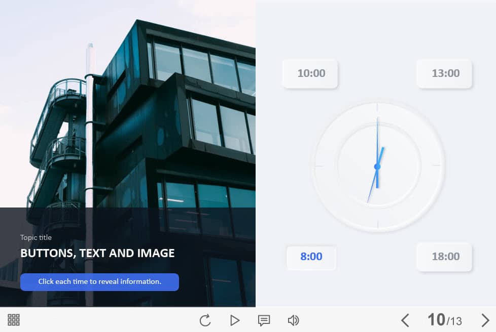 Clickable Time — Captivate Template. The eLearning interaction slide would become a great addition for your eCourse. It contains four clickable objects designed as time clocks. The user must click on each of them to reveal the additional information. The template is compatible with Captivate 2019 software. All you need is just to paste the template into your project and to fill it with own learning materials. Try to create better courses with our amazing Adobe Captivate templates!