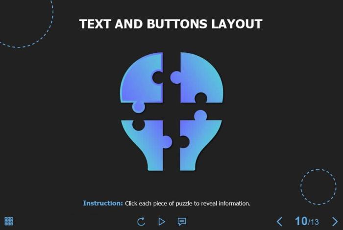 Jigsaw Puzzle — Captivate 2019 Template. The eLearning interaction slide would become a great addition for your eCourse. It contains 4 clickable objects designed as pieces of a jigsaw puzzle. The user must click on each of them to reveal the additional information. The template is compatible with Captivate 2019. All you need is just to paste the template into your project and to fill it with own learning materials. Try to create better courses with our amazing Adobe Captivate templates!