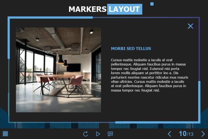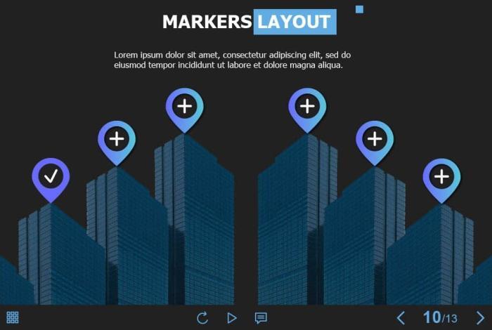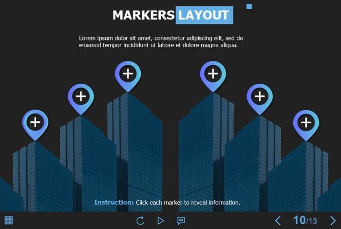 Marker Buttons — Captivate 2019 Template. The eLearning interaction slide would become a great addition for your eCourse. It contains 6 clickable objects designed as map markers. The user must click on each of them to reveal the additional information in pop-ups. The template is compatible with Captivate 2019 software. All you need is just to paste the template into your project and to fill it with own learning materials. Try to create better courses with our amazing Adobe Captivate templates!