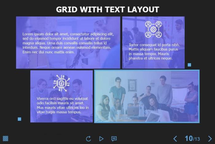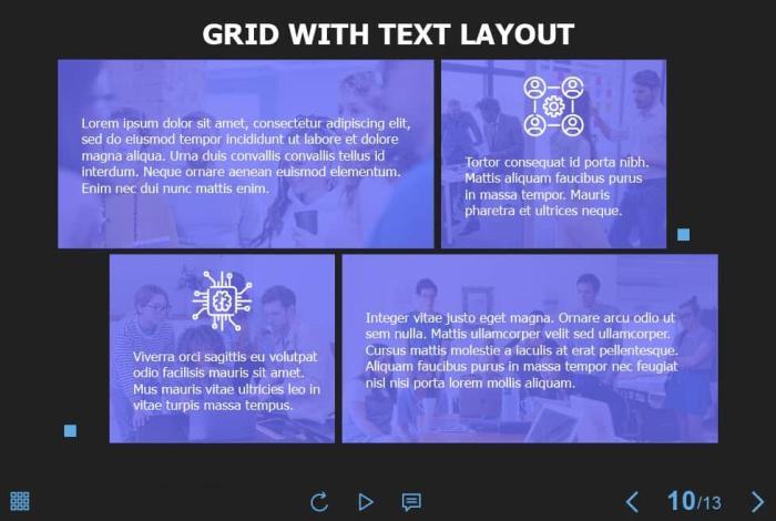 Grid Pictures — Captivate 2019 Template. The eLearning interaction slide would become a great addition for your eCourse. It contains 4 clickable pictures. The user must click on each of them to reveal the additional information. The template is compatible with Captivate 2019 software. All you need is just to paste the template into your project and to fill it with own learning materials. Try to create better courses with our amazing Adobe Captivate templates!