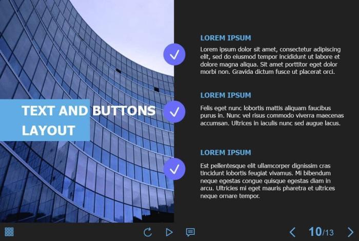 Round Buttons — Captivate 2019 Template. The eLearning interaction slide would become a great addition for your eCourse. It contains 3 clickable objects designed as circles with plus icons. The user must click on each of them to reveal the additional information. The template is compatible with Captivate 2019 software. All you need is just to paste the template into your project and to fill it with own learning materials. Try to create better courses with our amazing Adobe Captivate templates!