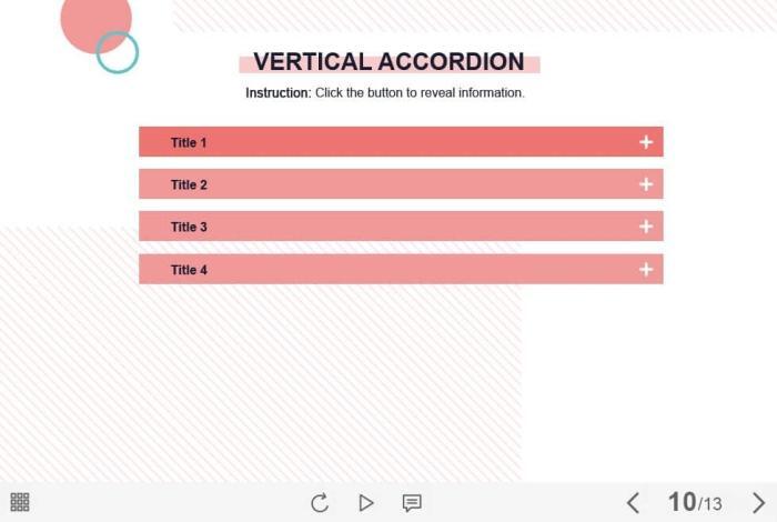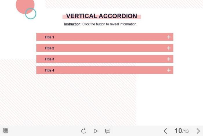 Vertical Accordion — Captivate Template. The eLearning interaction slide would become a great addition for your eCourse. It contains 4 clickable objects. The user must click on each of them to reveal the additional information. The template is compatible with Captivate 2019 software. All you need is just to paste the template into your project and to fill it with own learning materials. Try to create better courses with our amazing Adobe Captivate templates!