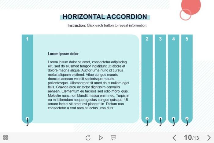 Horizontal Accordion — Captivate Template. The eLearning interaction slide would become a great addition for your eCourse. It contains 5 clickable objects. The user must click on each of them to reveal the additional information. The template is compatible with Captivate 2019 software. All you need is just to paste the template into your project and to fill it with own learning materials. Try to create better courses with our amazing Adobe Captivate templates!