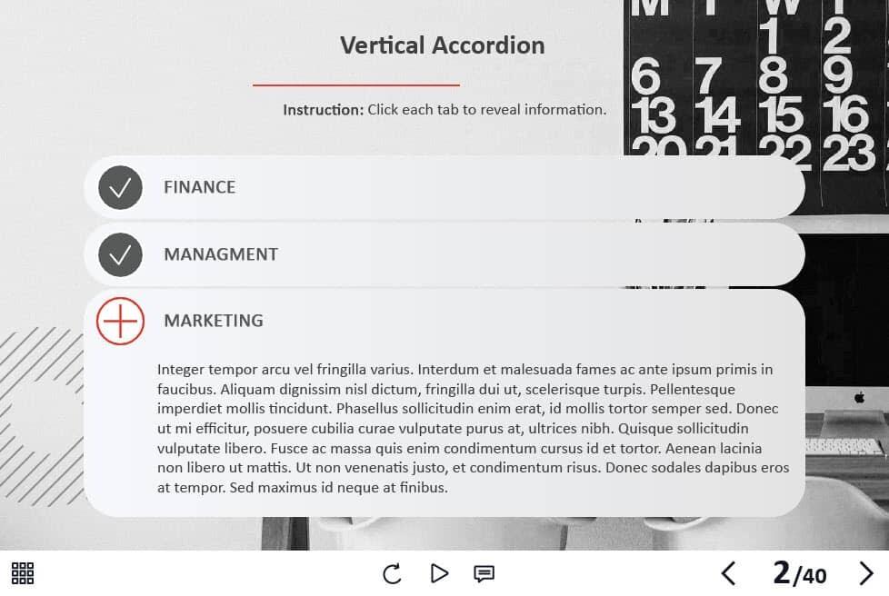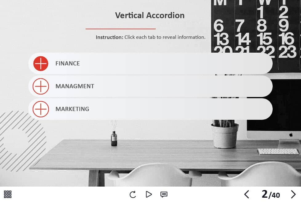 Vertical Accordion — Captivate Template. The eLearning interaction slide would become a great addition for your eCourse. It contains three tabs with round icons. The user must click on each of them to reveal the additional information. The template is compatible with Captivate 2019 software. All you need is just to paste the template into your project and to fill it with own learning materials. Try to create better courses with our amazing Adobe Captivate templates!