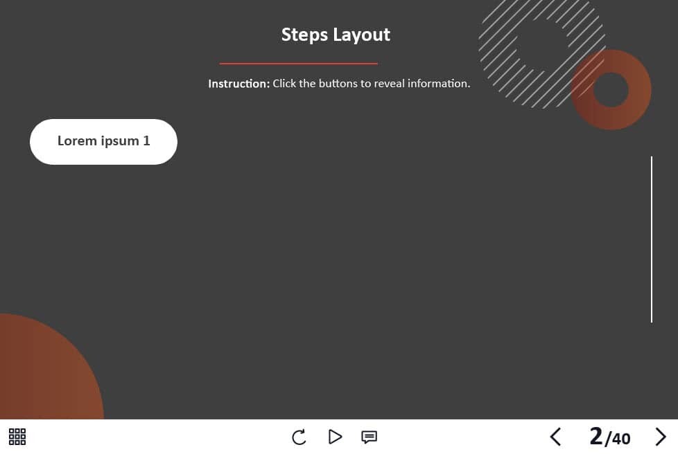 Process Stages — Captivate Template. The eLearning interaction slide would become a great addition for your eCourse. It contains four buttons. The user must click on each of them to reveal the additional information. The template is compatible with Captivate 2019 software. All you need is just to paste the template into your project and to fill it with own learning materials. Try to create better courses with our amazing Adobe Captivate templates!
