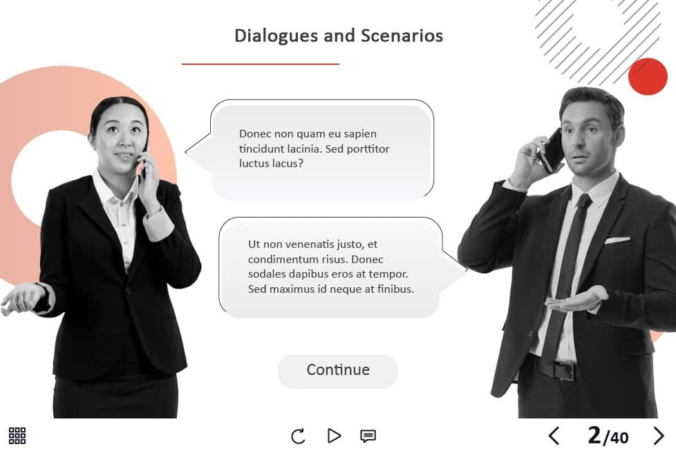 Dialogue — Captivate Template. The eLearning interaction slide would become a great addition for your eCourse. It contains three slides with dialogues between cutout characters. The user must click on the Continue button to reveal the additional information. The template is compatible with Captivate 2019 software. All you need is just to paste the template into your project and to fill it with own learning materials. Try to create better courses with our amazing Adobe Captivate templates!