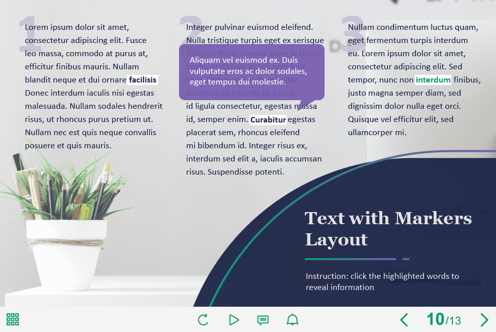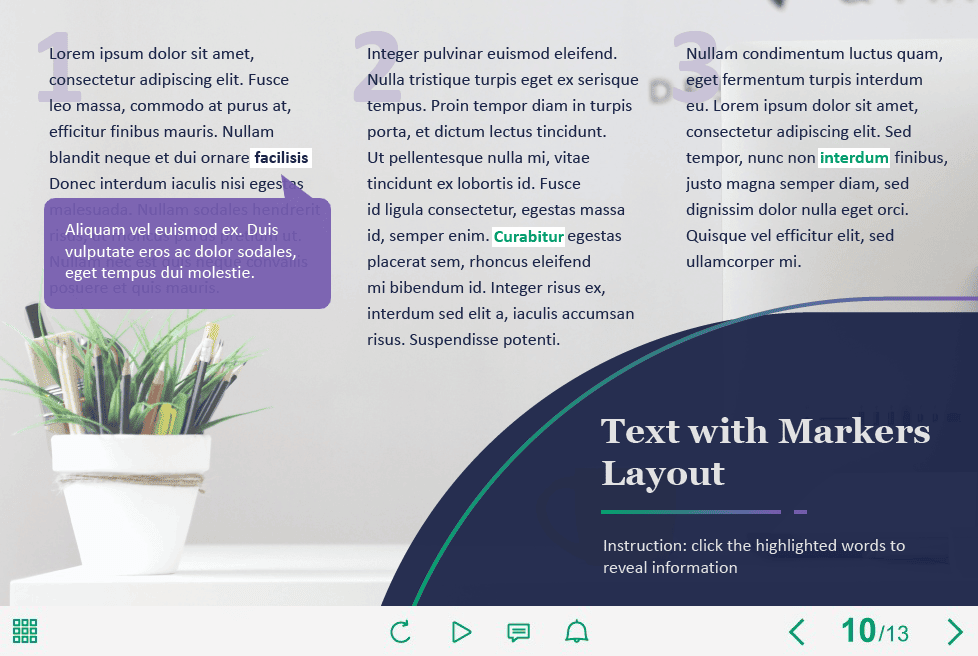 Text Markers — Captivate Template. The eLearning interaction slide would become a great addition for your eCourse. It contains 3 markers designed as clickable words. The user must click on each of them to reveal the additional information. The template is compatible with Captivate 2019 software. All you need is just to paste the template into your project and to fill it with own learning materials. Try to create better courses with our amazing Adobe Captivate templates!