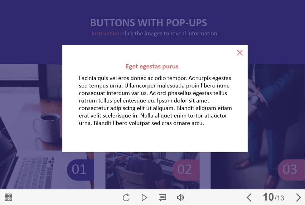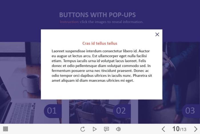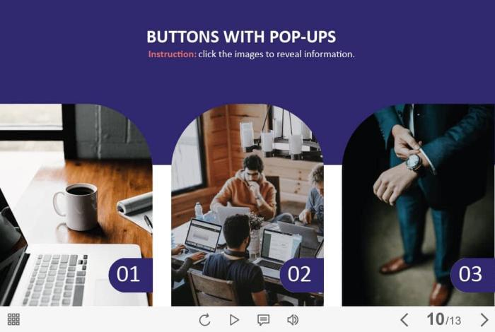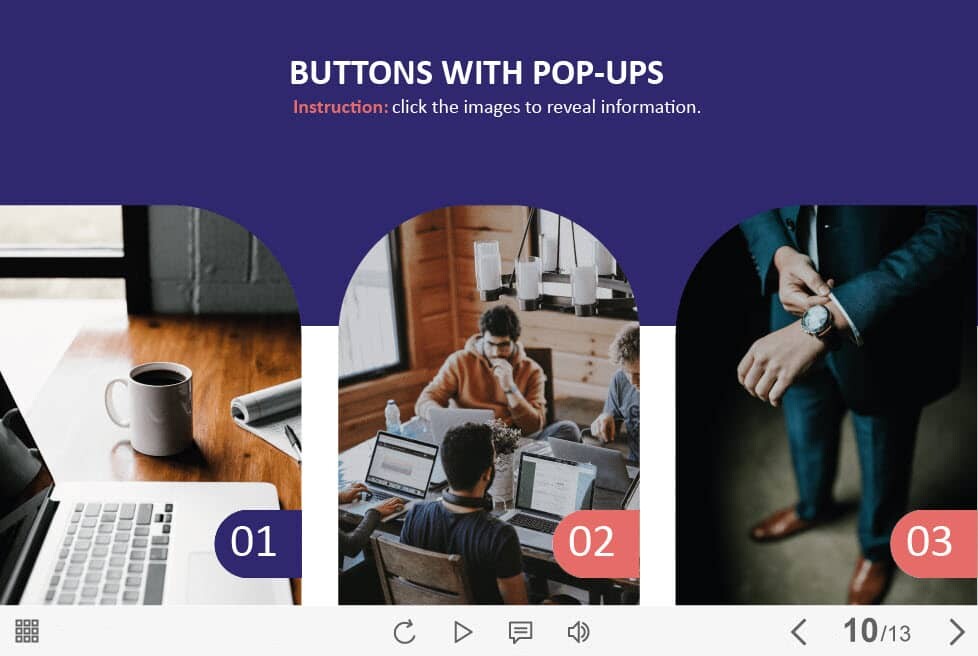 Three Clickable Images — Captivate Template. The eLearning interaction slide would become a great addition for your eCourse. It contains three images with numbers. The user must click on each of them to reveal the additional information. The template is compatible with Captivate 2019 software. All you need is just to paste the template into your project and to fill it with own learning materials. Try to create better courses with our amazing Adobe Captivate templates!
