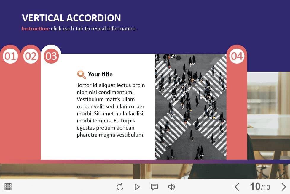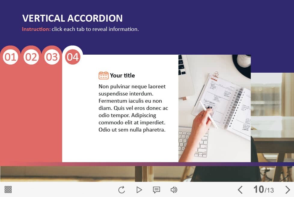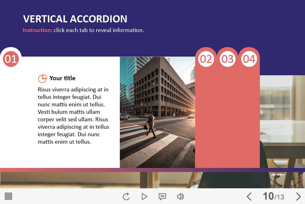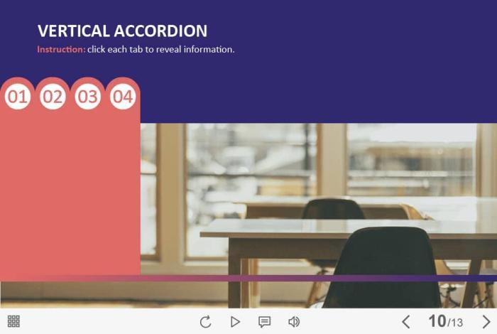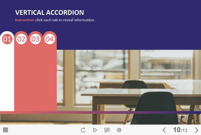 Horizontal Accordion — Captivate Template. The eLearning interaction slide would become a great addition for your eCourse. It contains four tabs that are arranged in the left part of the screen. The user must click on each of them to reveal the additional information. The template is compatible with Captivate 2019 software. All you need is just to paste the template into your project and to fill it with own learning materials. Try to create better courses with our amazing Adobe Captivate templates!