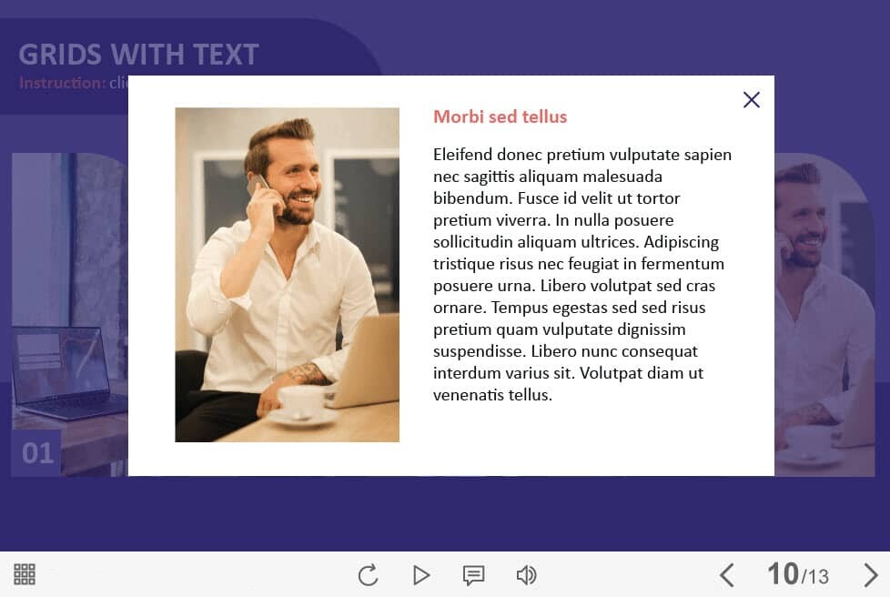 Five Clickable Images — Captivate Template. The eLearning interaction slide would become a great addition for your eCourse. It contains five images with numbers. The user must click on each of them to reveal the additional information. The template is compatible with Captivate 2019 software. All you need is just to paste the template into your project and to fill it with own learning materials. Try to create better courses with our amazing Adobe Captivate templates!