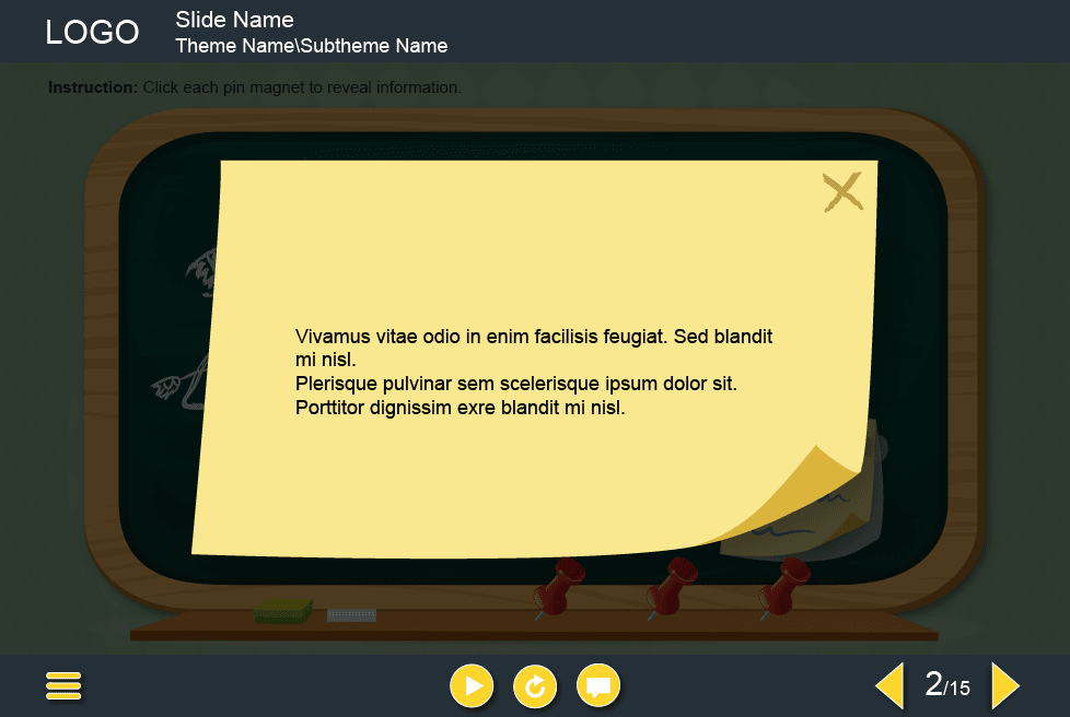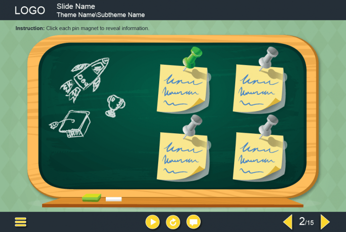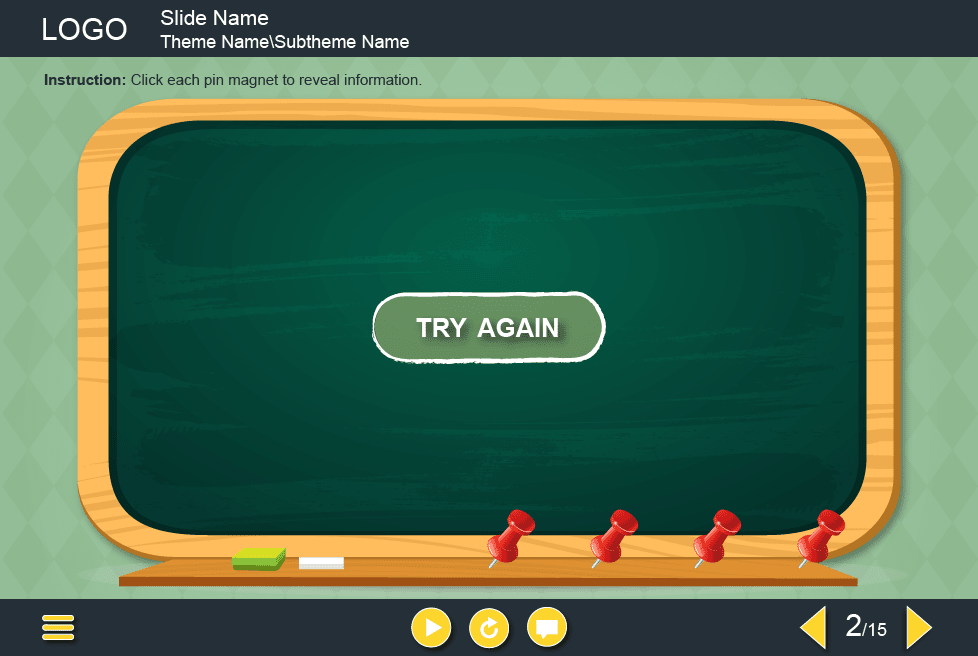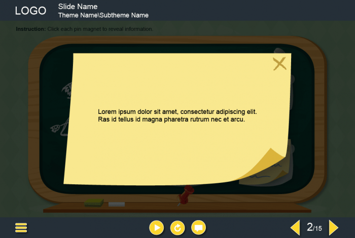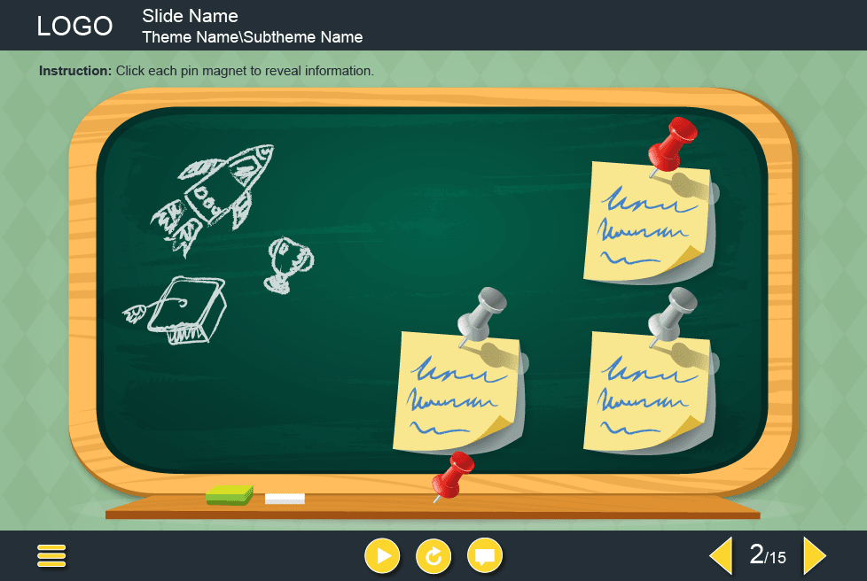 Captivate Stickers Pinned By Magnets Template is a ready-to-use template based on Adobe Captivate 9 software. It contains four clickable objects designed as the stickers pinned to the chalkboard by magnets. The user must click on each of them to reveal the additional information in pop-up windows. This template allows you to present the course information in a creative way. It would be an excellent addition for your own elearning project. The interaction can be built into any Captivate course player. Perfectly runs on both PC and tablet.