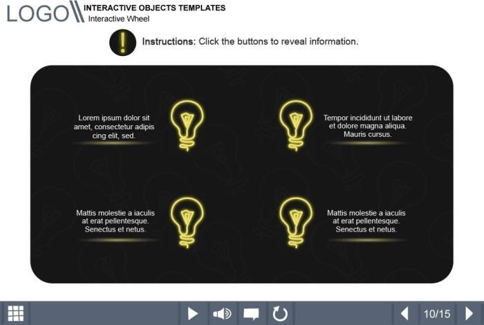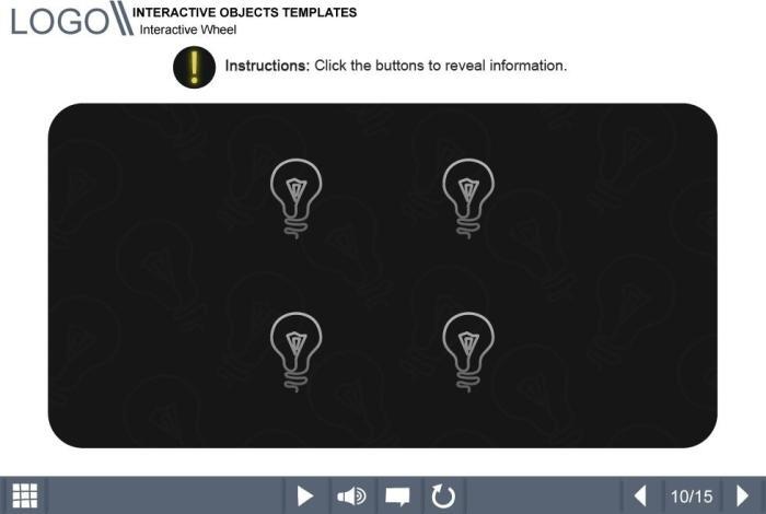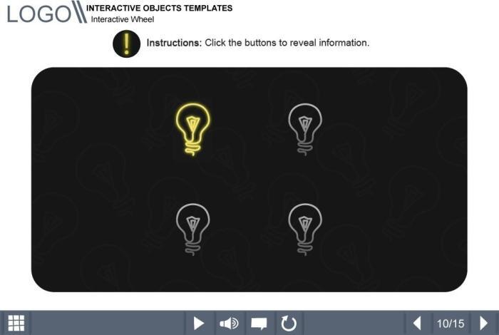 Captivate Clickable Light Bulbs Template. It contains four iconic buttons designed in the form of the incandescent light bulbs. The user must click on each lamp to reveal the course information. This template would be useful for creating powerful elearning courses by using Adobe Captivate 9 or higher. It is already prepared for usage. This eLearning template can be launched on both PC and tablet.