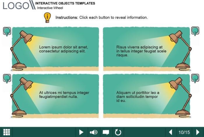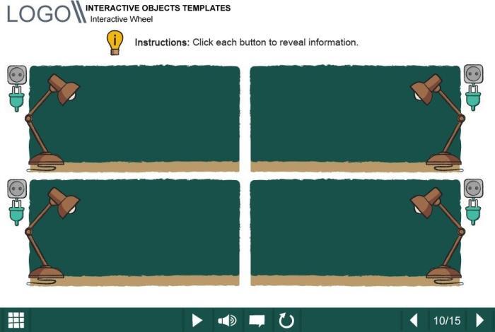 Captivate Switching The Lamps Template. It contains four clickable buttons designed in the form of plugs and sockets. The user must click on each button to switch on the lamps and reveal the course information. This template would be useful for creating powerful elearning courses by using Adobe Captivate 9 or higher. It is already prepared for usage. This eLearning template can be launched on both PC and tablet.