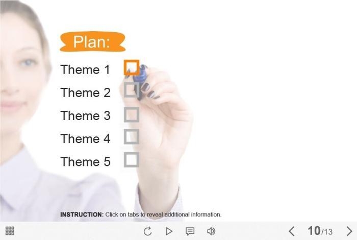 Fill in The Plan — Captivate Template is a ready-to-use elearning template based on Adobe Captivate 9 software. There are five answer options where the user must put the check marks. Each option reveals a popup window with a course information of any type. A wide range of ready-made Adobe Captivate templates will simplify the process of e-course creating. It’s one of the most popular authoring tools among beginners and elearning professionals.