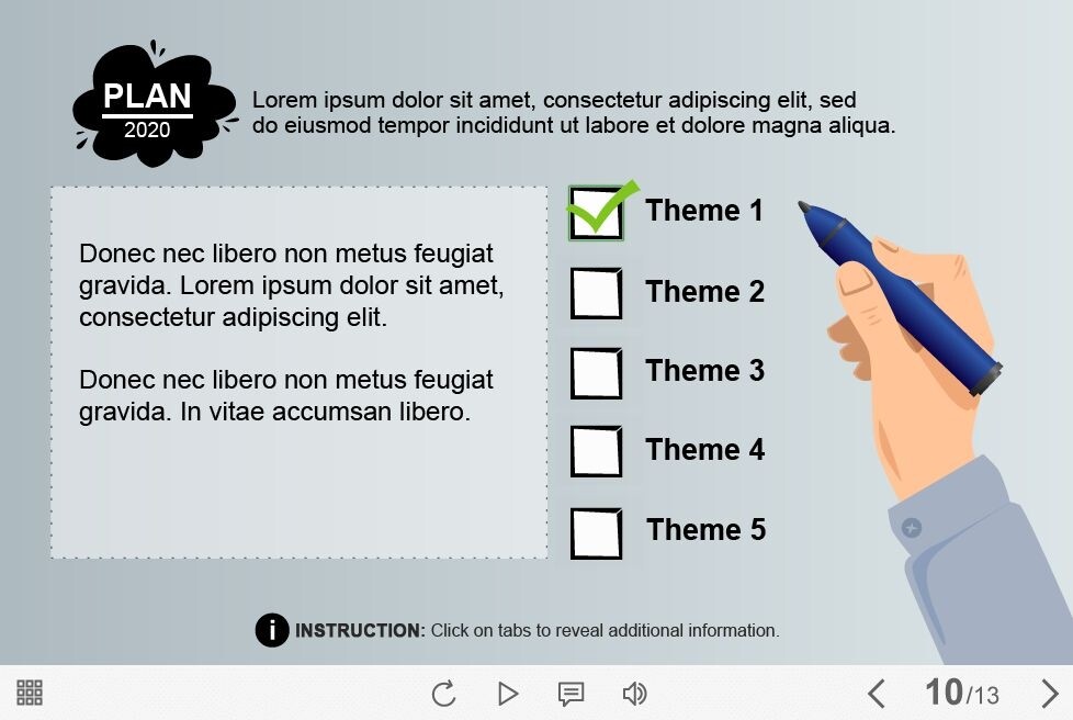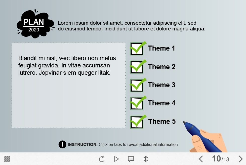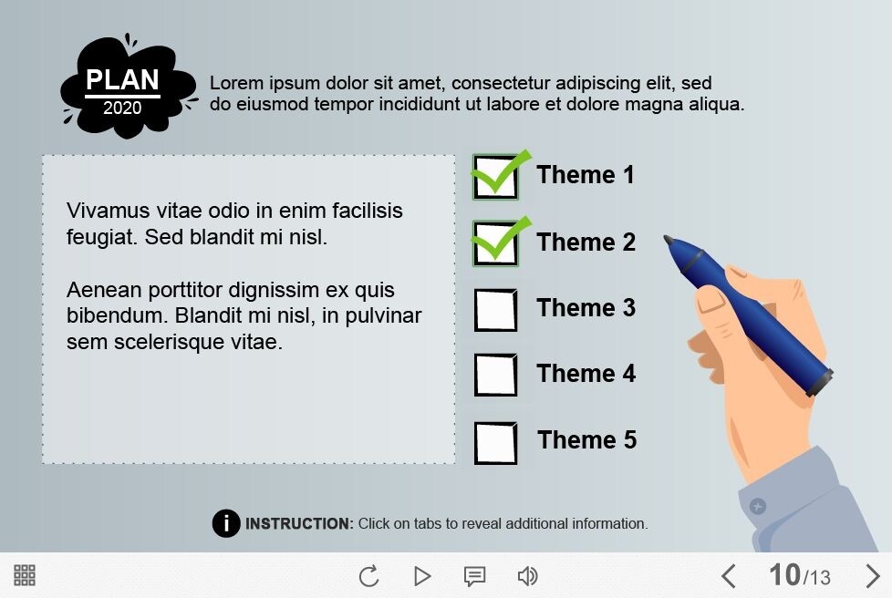 Filling Check Boxes — Captivate Template is a ready-to-use elearning template based on Adobe Captivate 9 software. It contains five answer options where the user should put the check marks. Each option reveals a popup window with a course information of any type. A wide range of ready-made Adobe Captivate templates will simplify the process of e-course creating. It’s one of the most popular authoring tools among beginners and elearning professionals.