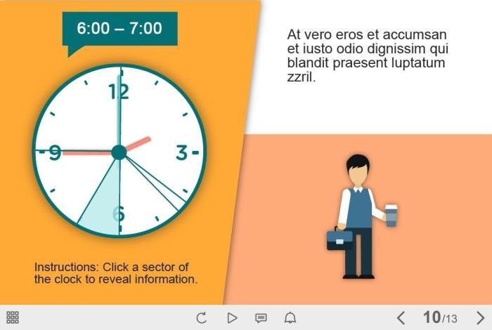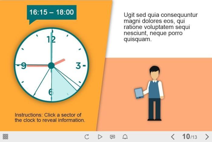 Captivate Segmented Clock Face Template. A well-designed elearning template would be a great choice to present the course information in an easily perceivable form. It contains a large clock face that is placed at the left part of the screen and is divided on 6 clickable segments. The user must click on each of them to reveal the learning materials.