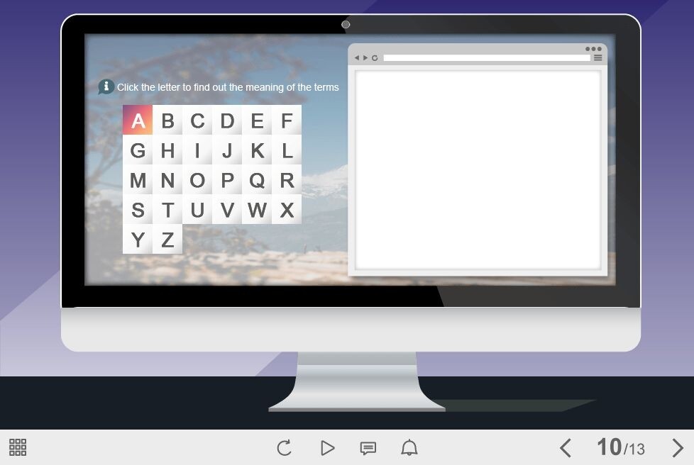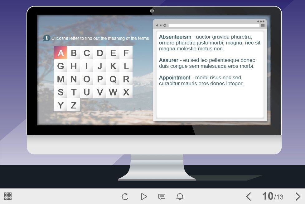 Captivate Vocabulary Template. Designed in variegated colors, this unique elearning interaction will surely help you to present the course information in a creative way. It contains 26 clickable letters placed on the left part of the screen. The user must click on each letter to find out the meaming of the terms for which a current letter is the capital letter. The Adobe Captivate template would be a great choice to create a powerful training course.