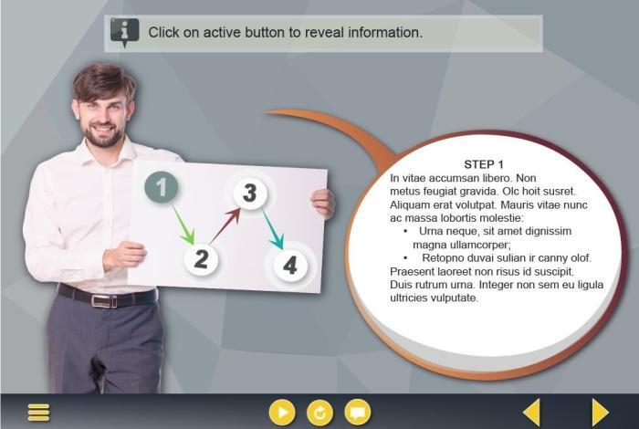 Captivate Round Buttons Over Businessman’s Board Template. Designed with Adobe Captivate 9 software and fully compatible with most latest tool versions. The interactive slide contains 4 round buttons, invented to reveal the learning materials. The cutout photo of a smiling young businessman with a white board is used to illustrate the course narrator. The template is already designed and prepared fot usage.