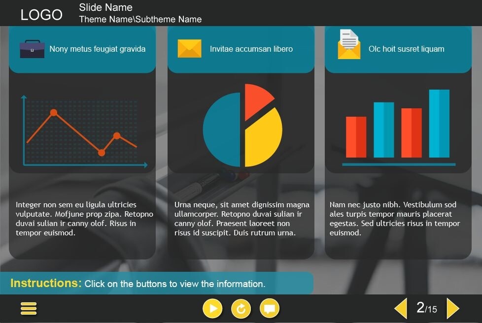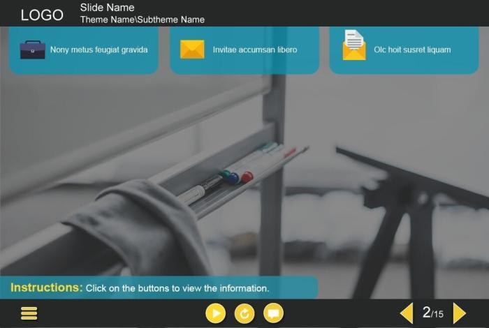 Captivate Three Horizontal Tabs Template. Designed with Adobe Captivate 9 software and fully compatible with the latest tool versions. The interactive slide contains a horizontal block with 3 clickable tabs, invented to reveal the learning materials. It is already designed and prepared fot usage.