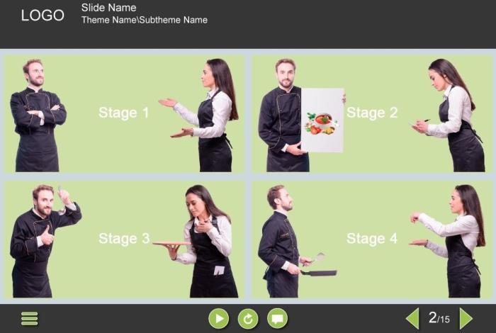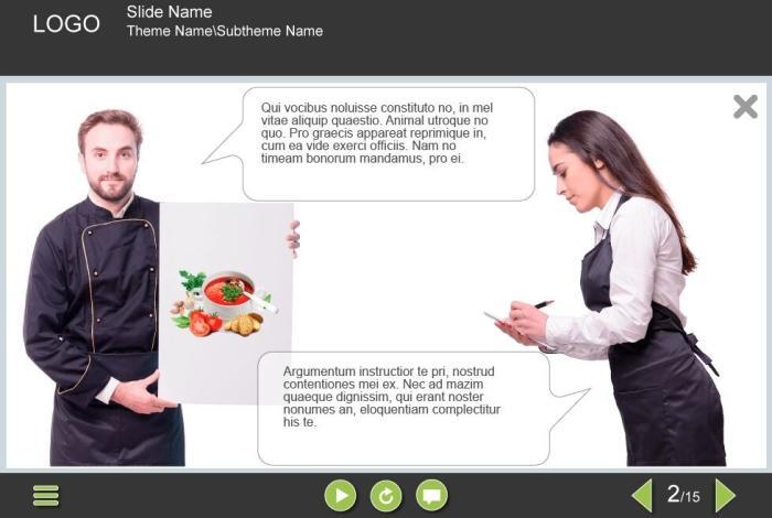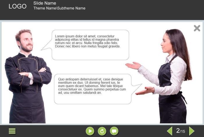 Dialogues in Grid Images — Captivate Template. The unique elearning interaction is designed with Adobe Captivate 9 and is fully compatible with the most recent tool versions. It contains 4 grid pictures with the cutout characters talking to each other: a handsome young chef with an attractive waitress. The user must click on each grid image to view the whole visual story.