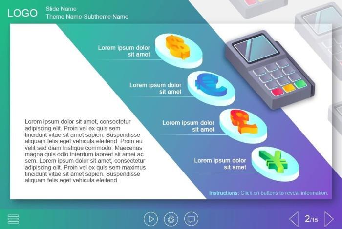 Buttons with Currency Icons — Captivate Template. The unique eLearning template is designed with Adobe Captivate 9 authoring tool. It contains 4 buttons with the currency icons. The user must click on each of them to reveal the training materials. This template would be an excellent choice to create a powerful training course.