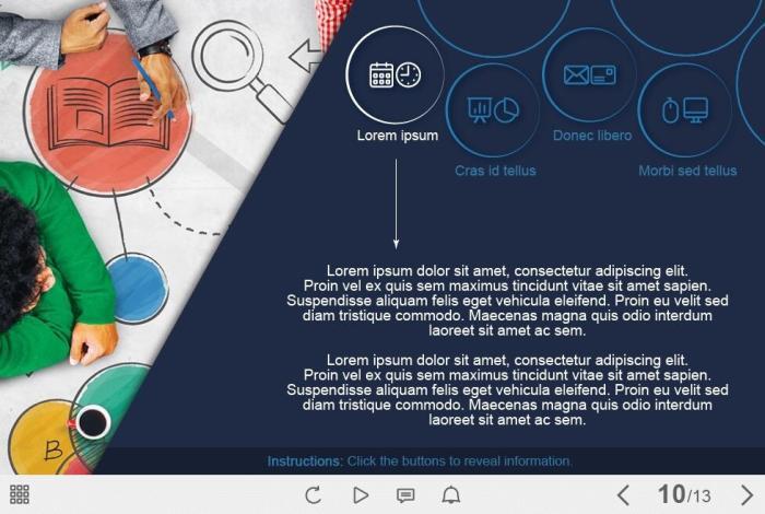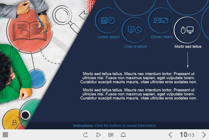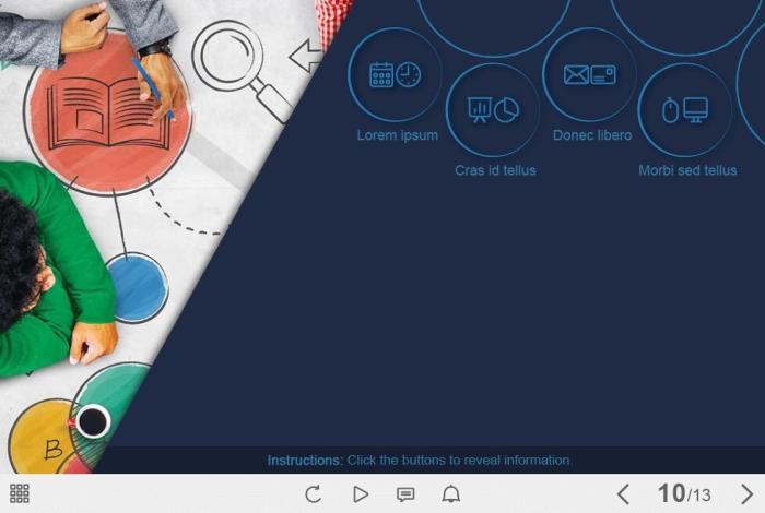 Round Buttons with Icons — Captivate Template. The eLearning interaction would be a great choice to represent the course materials in an easy comprehensible way. It contains 4 clickable buttons located at the top part of the screen. The user must click on each button to reveal the additional information.