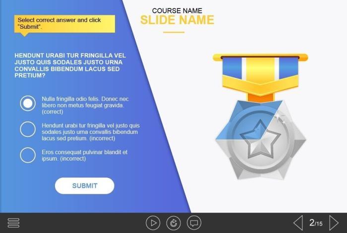 Medal Quiz — Captivate Template. The unique eLearning template is designed with Adobe Captivate 9 authoring tool. The user must click on each of three medal sections and complete each single choice quiz. The interaction would be an excellent choice to check learner’s knowledge. The Captivate template is fully compatible with the 2017 / 2019 tool versions. All you need is just to insert the template into your training project and fill it with own eLearning content. Try to use our fascinating templates to create better courses.