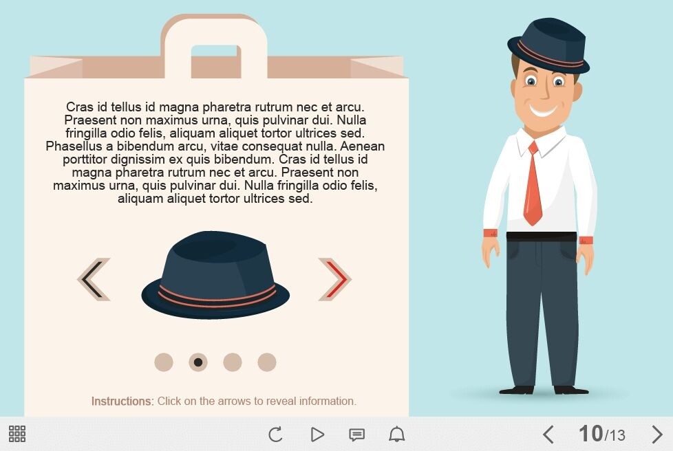 Equipping Character with Items — Captivate Template. The well-designed interaction slideshow is composed of four slides. The template contains handsome vector character – a smiling young man dressed in formal clothes. The user must click on the left and right arrows to switch between the sliders and reveal the additional information about the items which character holds.