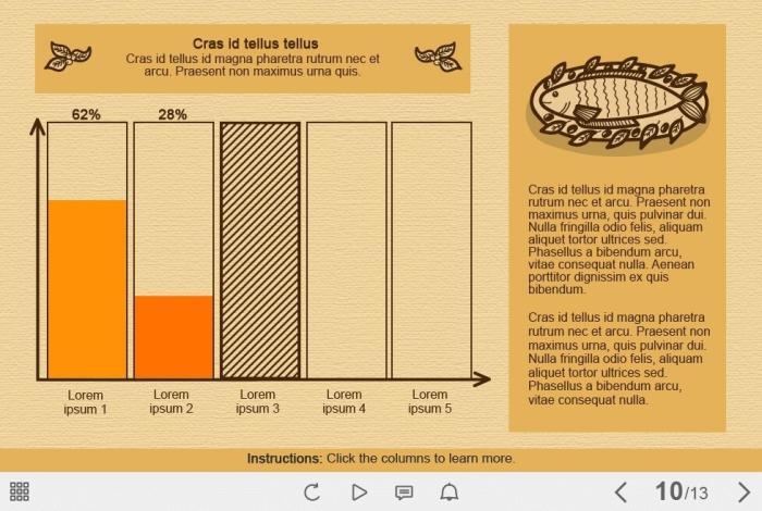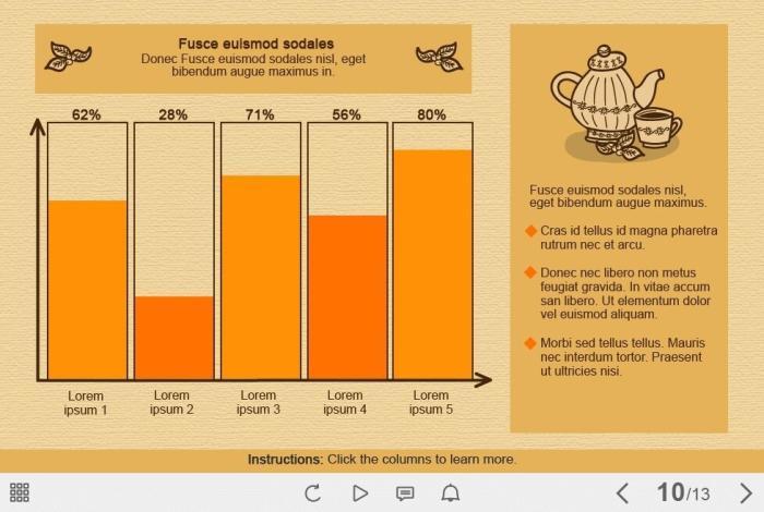 Interactive Column Chart — Captivate Template. The interactive slide contains a simple 5-column chart. The user must click on the columns to reveal the learning materials. This template would be a great addtiion to any kind of web-design project (e-Learning course, advertisement, marketing, etc.).