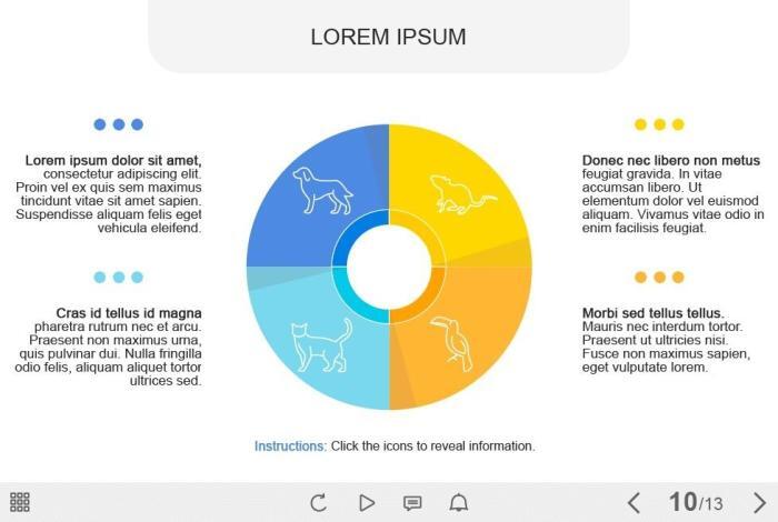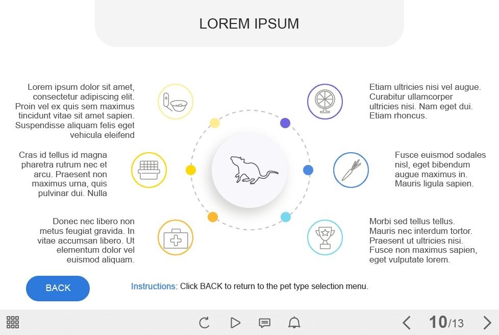 Pet Care — Captivate Template. The interactive slide contains four clickable buttons with animal icons. The user must click on them to reveal the learning materials about recommendations for the maintenance and care of each type of animal. This template would be a great addtiion to any kind of web-design project (e-Learning course, advertisement, marketing, etc.).
