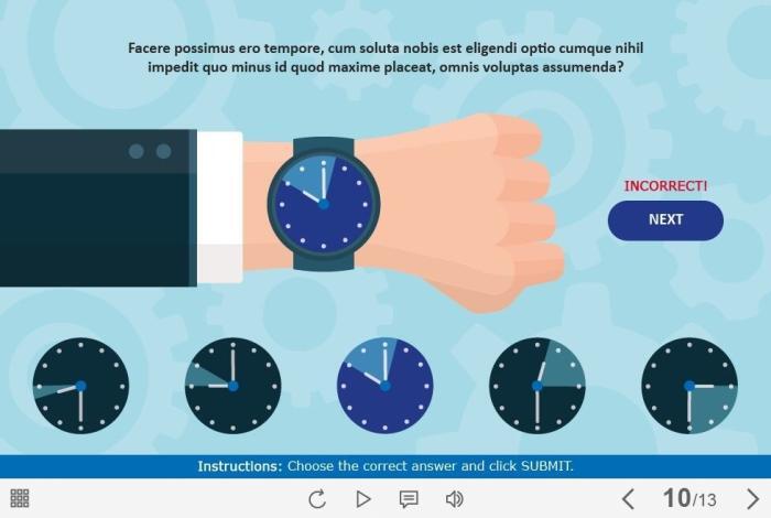Time Management Quiz — Captivate Template. The eLearning interaction slide would become a great addition for your eCourse. The template is composed of 5 single choice quizzes. The user must choose the correct answer to the appropriate field and click on the Submit button. The template is developed with Adobe Captivate 9 authoring tool. It is compatible with the most recent tool’s versions. All you need is just to paste the template into your project and to fill it with own learning materials. Try to create better courses with our amazing templates!