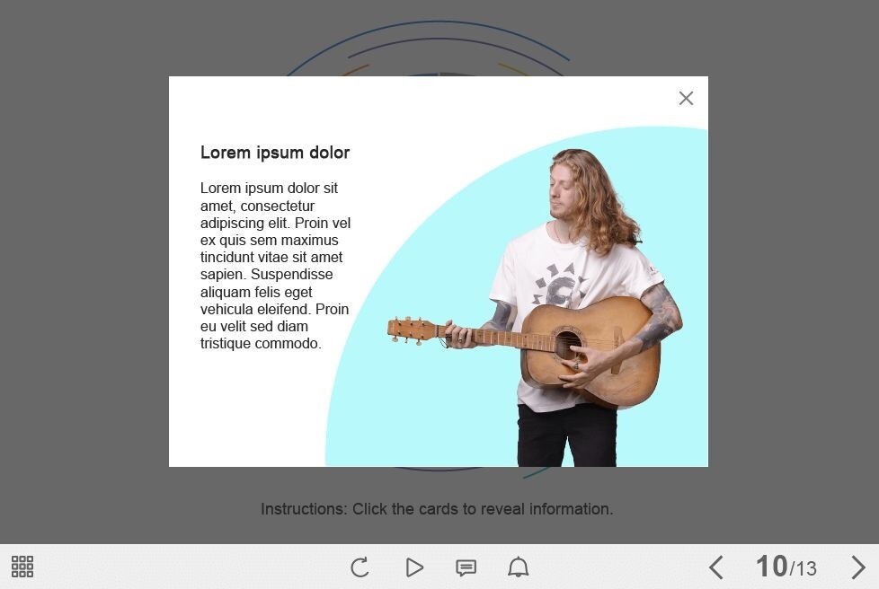 Sectors with Icons — Captivate Template. The eLearning interaction slide would become a great addition for your eCourse. It contains five clickable colorful sectors with icons. The user must click on each sector to reveal the additional information in pop-up windows.