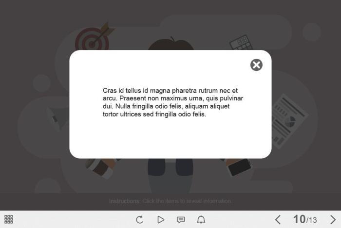 Clickable Management Icons — Captivate Template. The eLearning interaction slide would become a great addition for your eCourse. It contains six well-designed icons. The user must click on each icon to reveal the additional information in pop-ups. The template is developed with Adobe Captivate 9 authoring tool. It is compatible with the most recent tool’s versions. All you need is just to paste the template into your project and to fill it with own learning materials. Try to create better courses with our amazing templates!